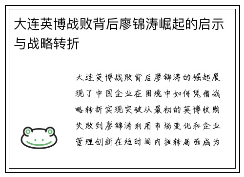 大连英博战败背后廖锦涛崛起的启示与战略转折